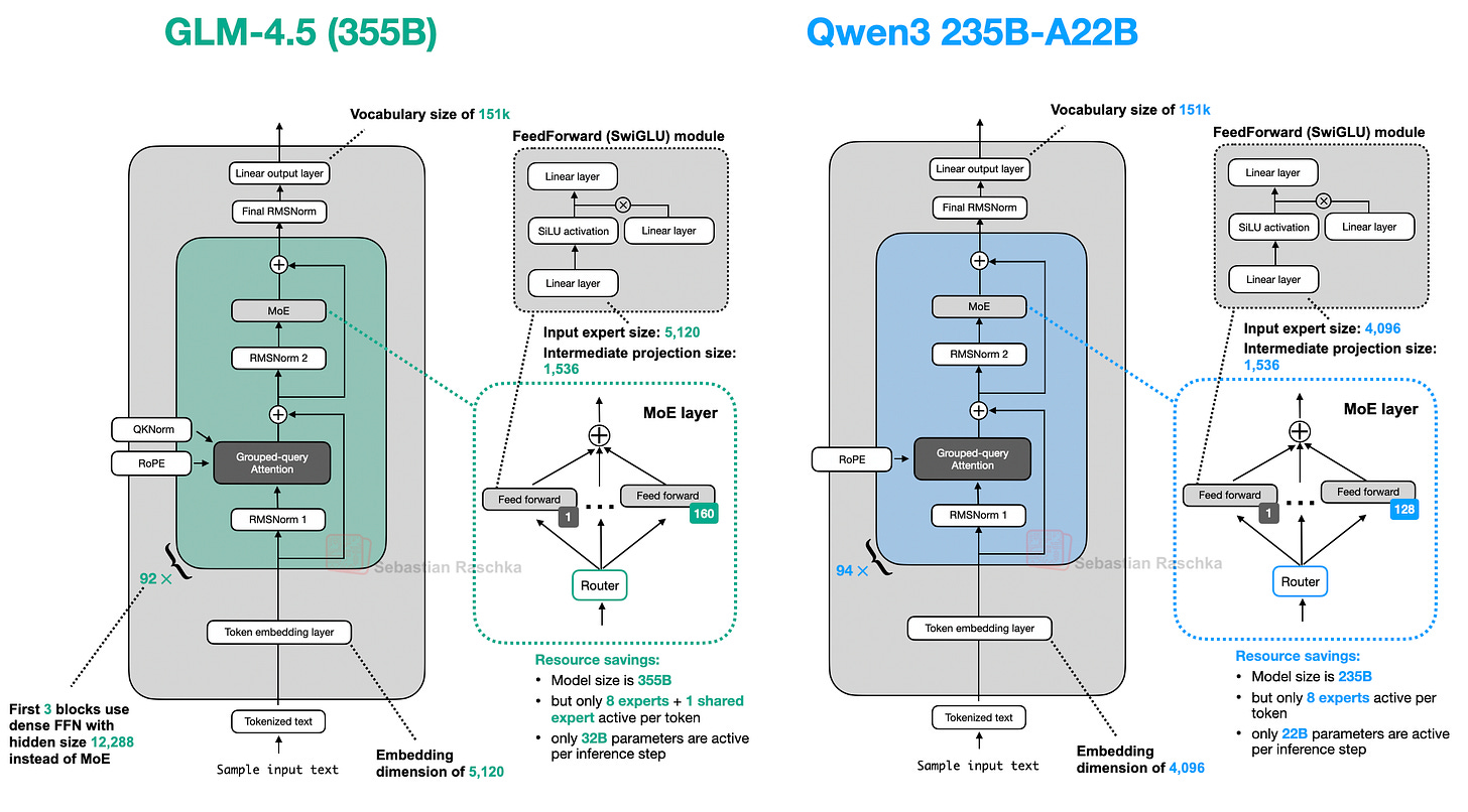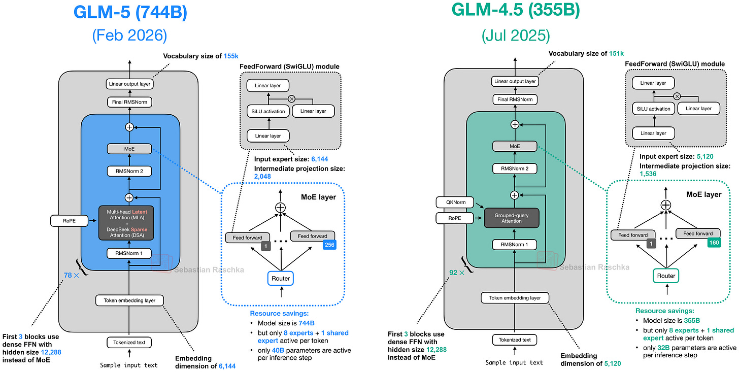 Compared to the GLM-4.5 model I covered earlier in this article (see section 11, released in summer 2025), its GLM-5 successor is twice the size: up from 355B parameters to 744B, pushing it into the territory between DeepSeek-V3.2 and Kimi K2.