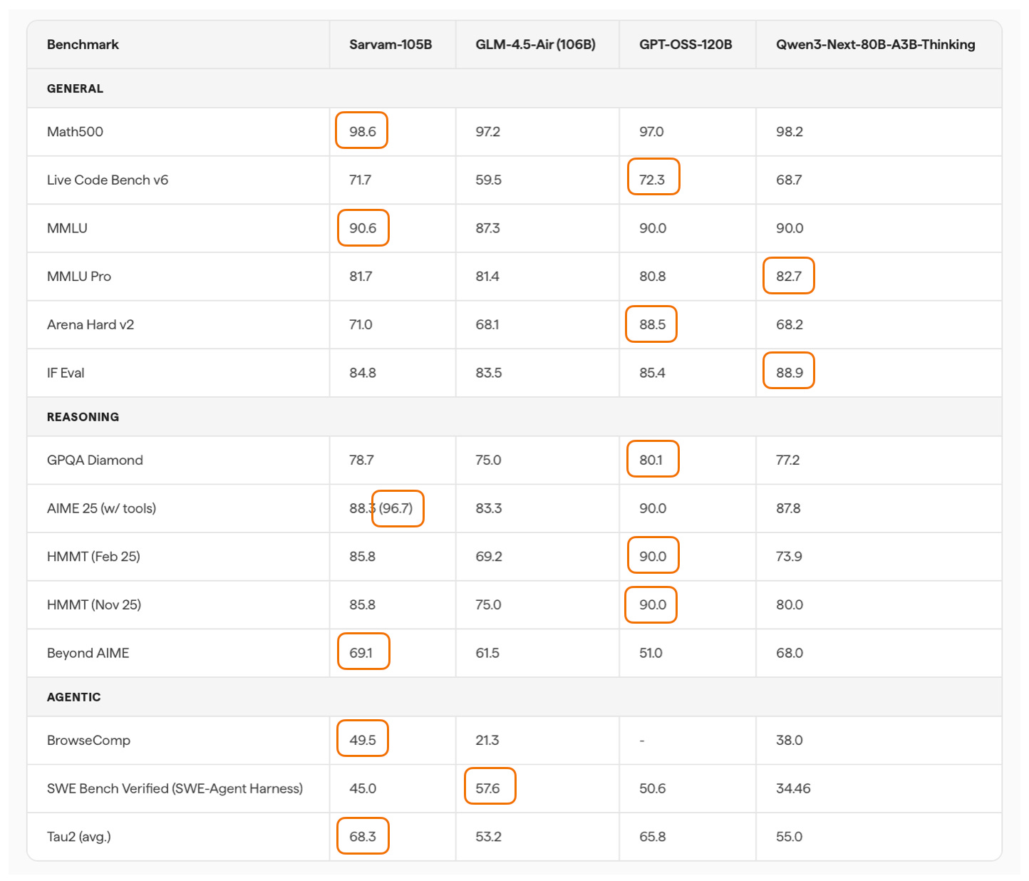 Speaking of modeling performance, the 105B model is on par with LLMs of similar size: gpt-oss 120B and Qwen3-Next (80B). Sarvam is better on some tasks and worse on others, but roughly the same on average.