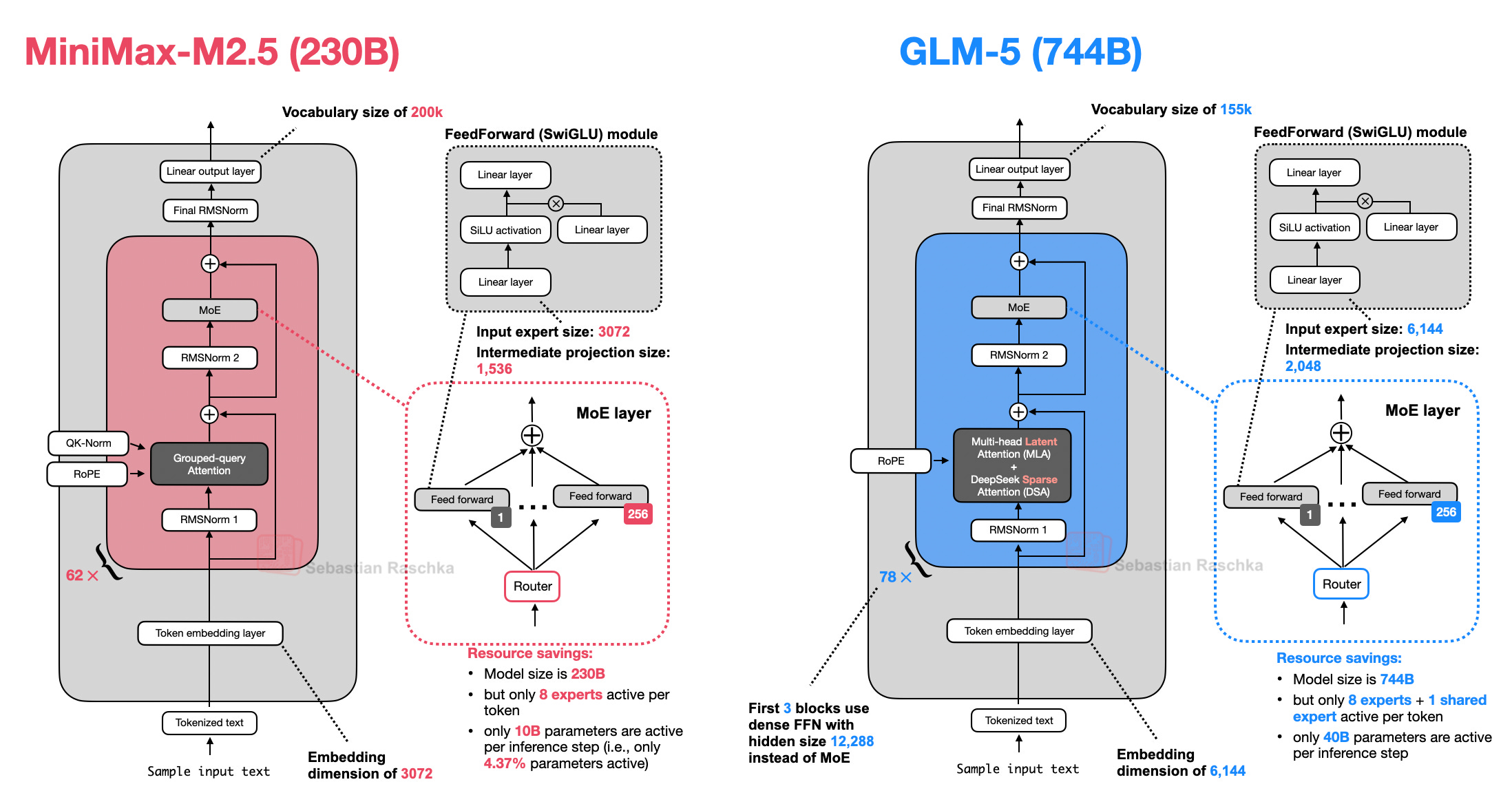 Architecture-wise, MiniMax M2.5 is a 230B model with a fairly classic design: just plain Grouped Query Attention, no sliding window attention or other efficiency improvements.