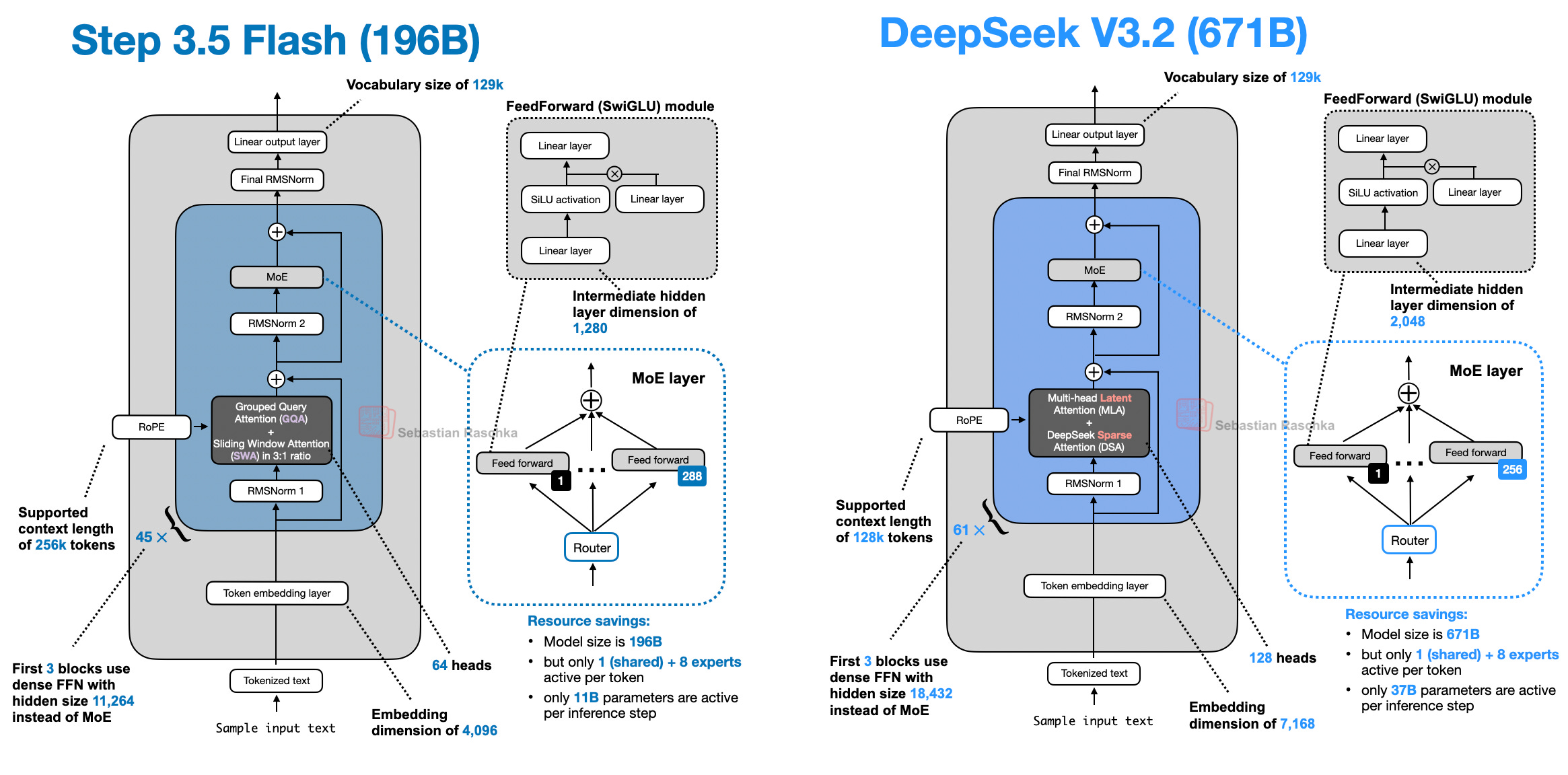 Step 3.5 Flash is a 196B parameter model that is more than 3x smaller than the recent DeepSeek V3.2 model (671B) while being slightly ahead in modeling performance benchmarks. According to the Step team, Step 3.5 Flash has a 100 tokens/sec throughput at a 128k context length, whereas DeepSeek V3.2 has only a 33 tokens/sec throughput on Hopper GPUs, according to the data on the Step model hub page.