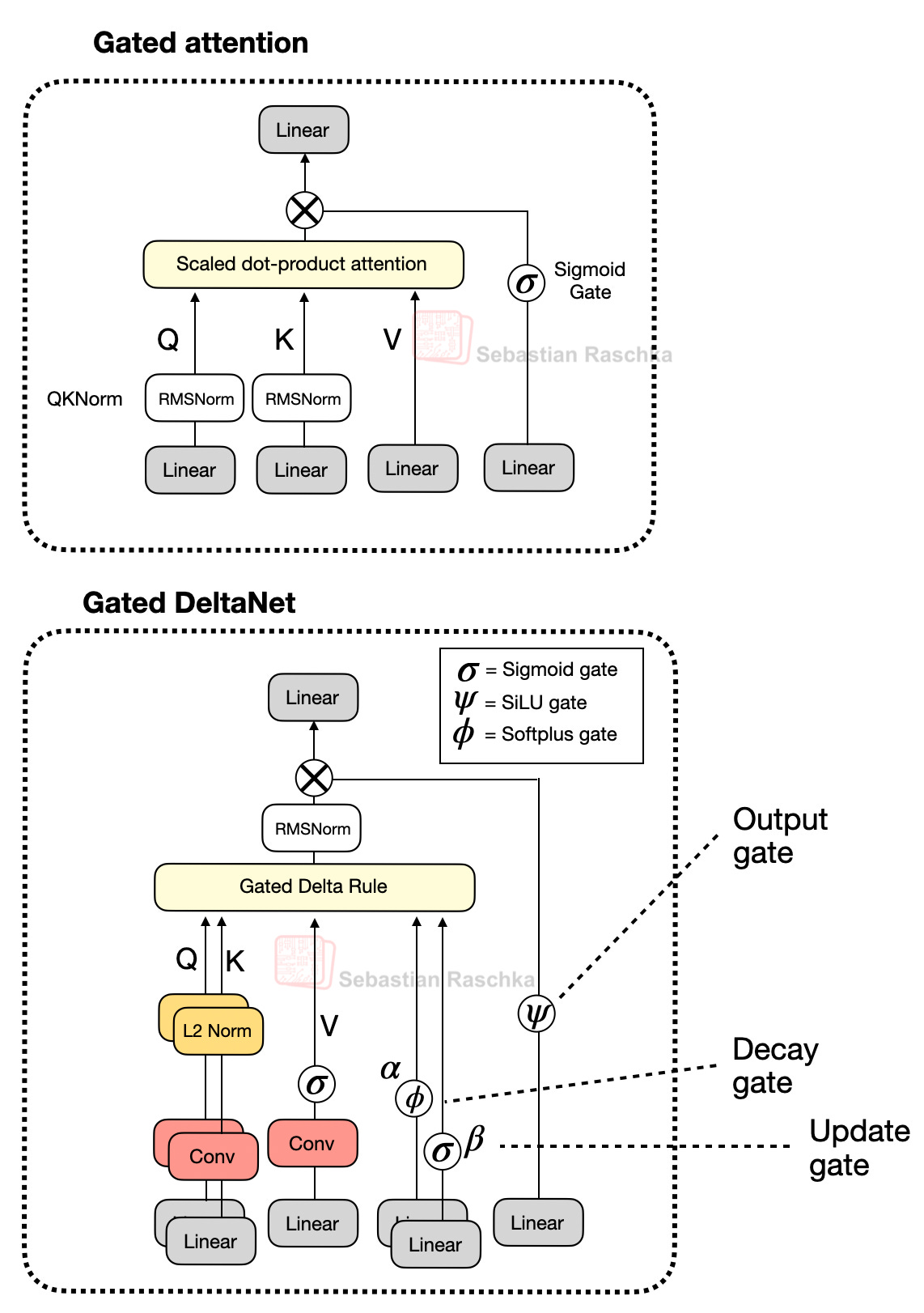 Gated DeltaNet has a gate similar to the gate in gated attention discussed earlier, except that it uses a SiLU instead of logistic sigmoid activation, as illustrated below. (The SiLU choice is likely to improve gradient flow and stability over the standard sigmoid.)