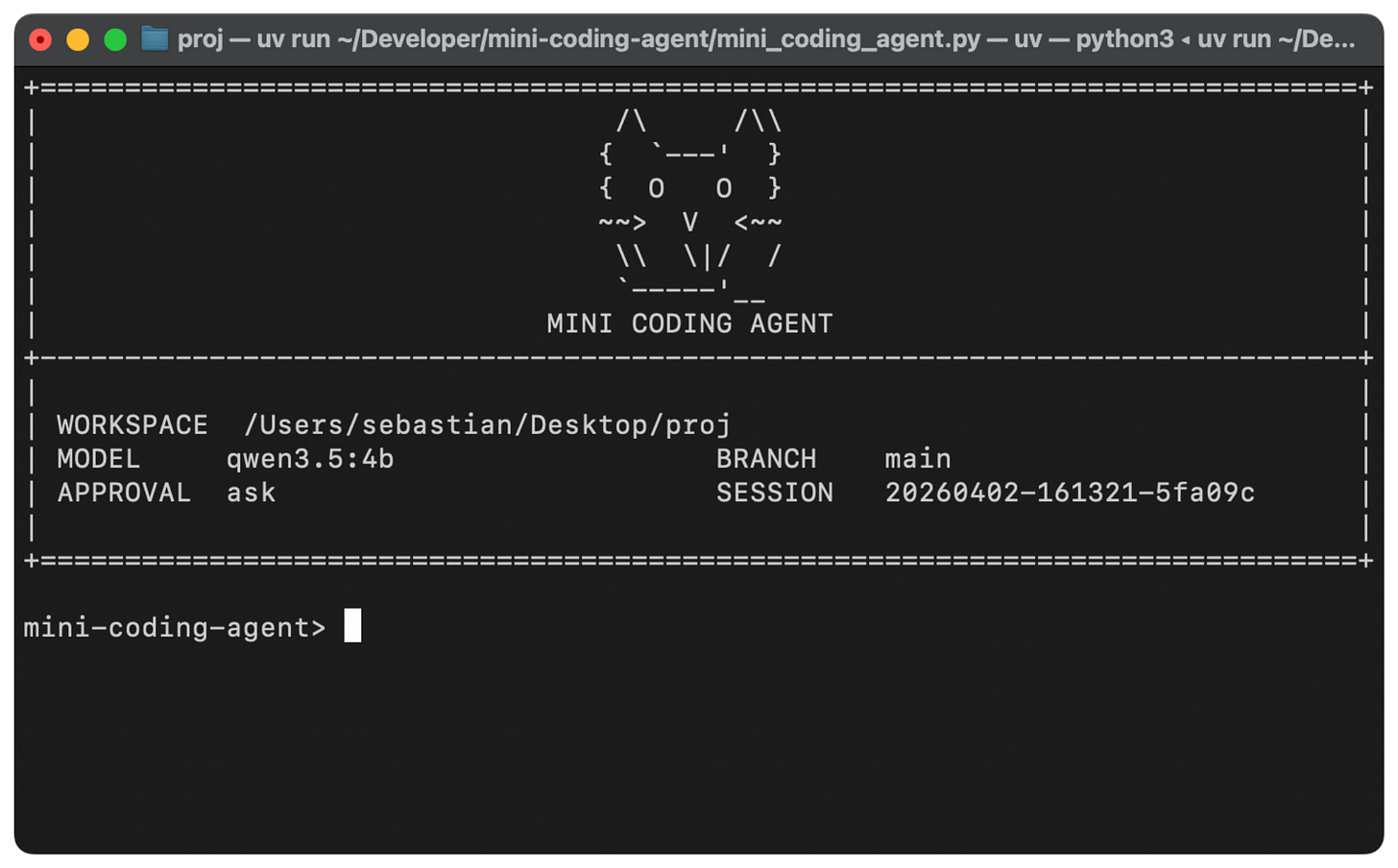To illustrate this, below is an example of how this usually looks to the user using my Mini Coding Agent. (This is not as pretty as Claude Code or Codex because it is very minimal and uses plain Python without any external dependencies.)