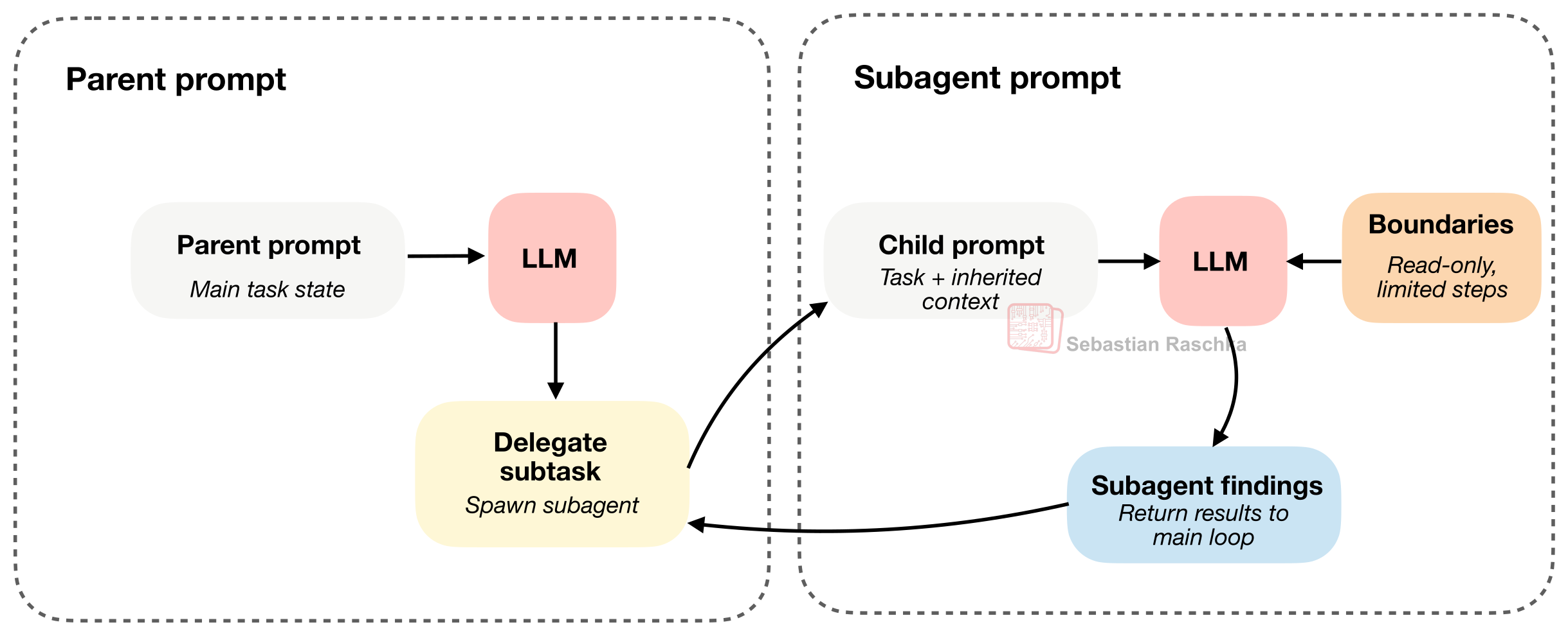 The trick here is that the subagent inherits enough context to be useful, but also has it constrained (for example, read-only and restricted in recursion depth)