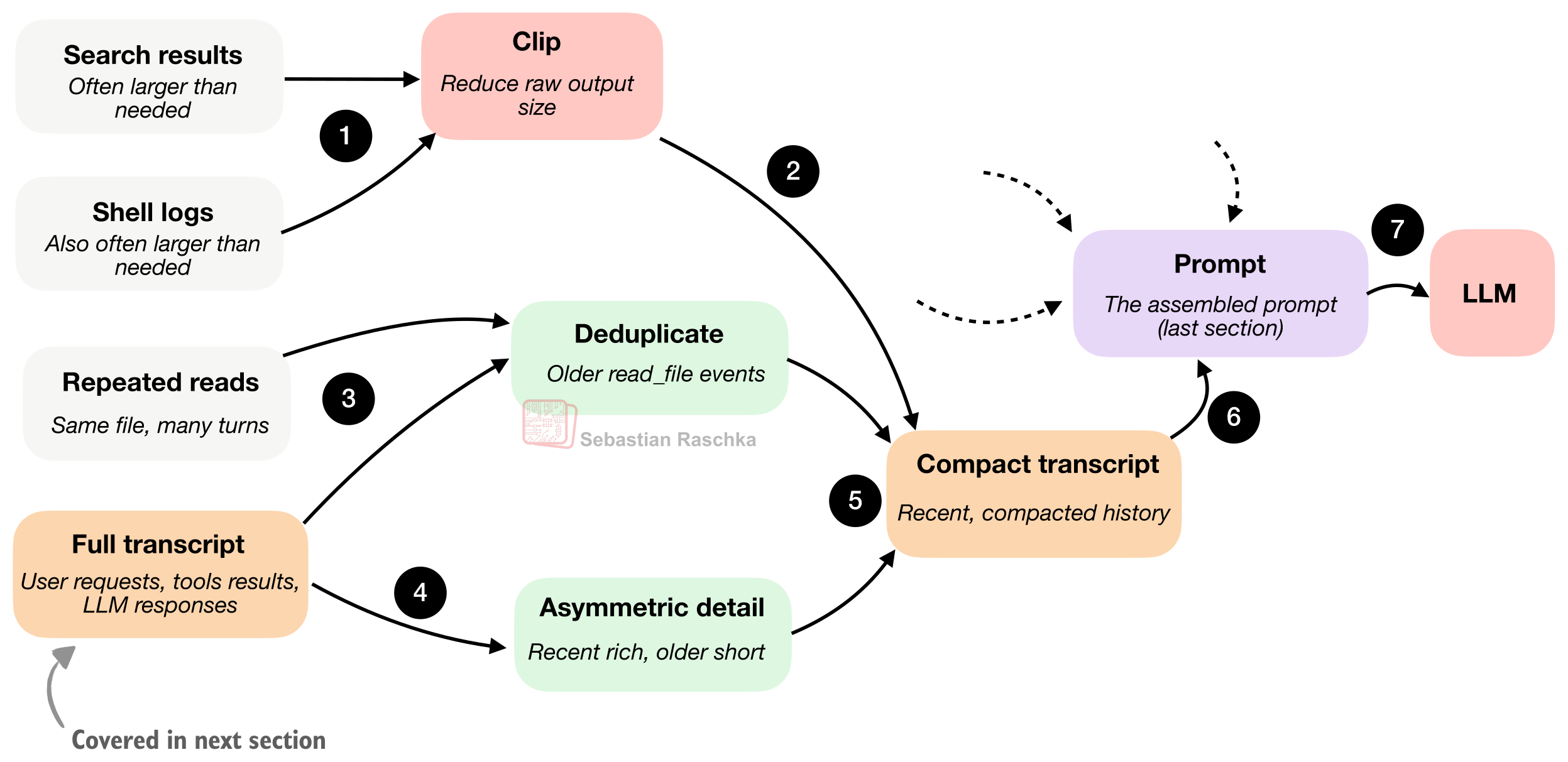 Conceptually, the context compaction in coding agents might work as summarized in the figure below. Specifically, we are zooming a bit further into the clip (step 6) part of Figure 8 in the previous section.
