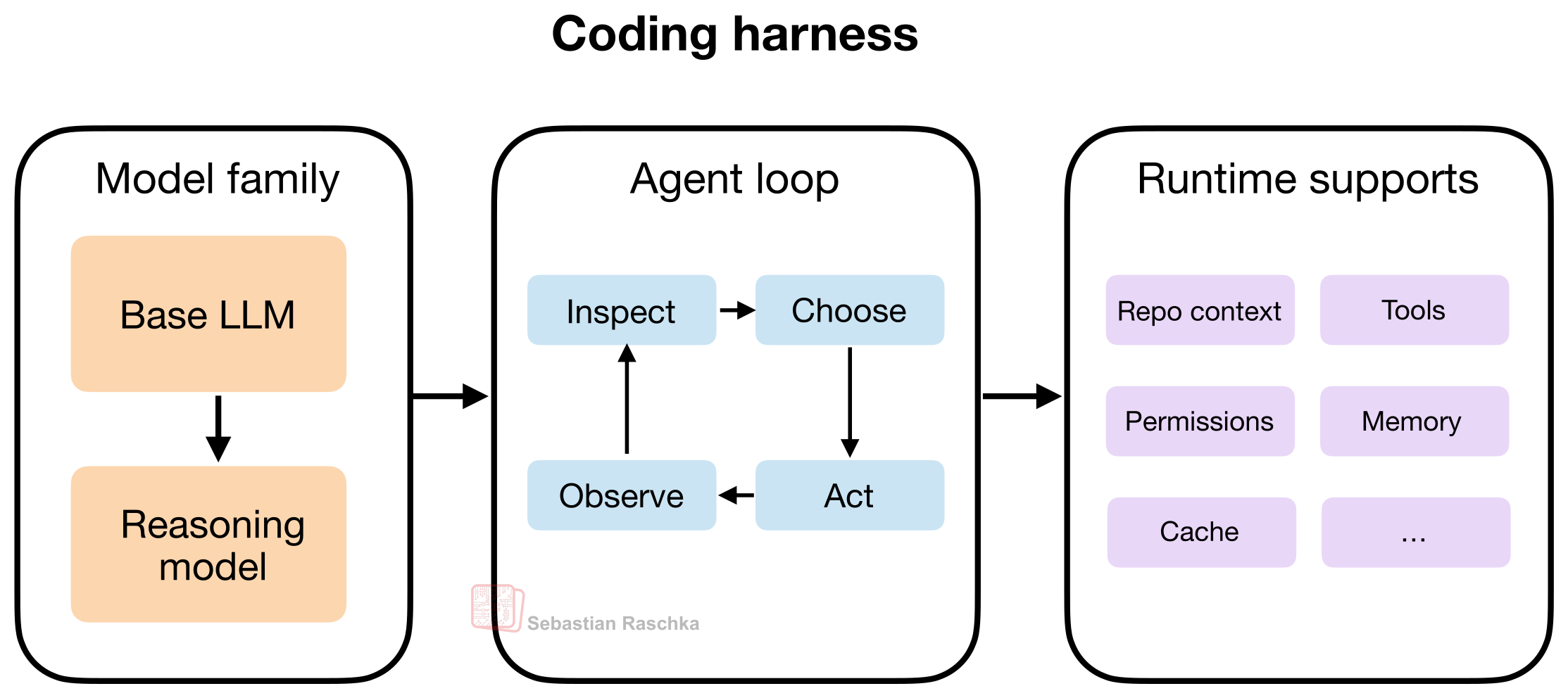 By the way, in this article, I use the terms “coding agent” and “coding harness” somewhat interchangeably for simplicity. (Strictly speaking, the agent is the model-driven decision-making loop, while the harness is the surrounding software scaffold that provides context, tools, and execution support.)