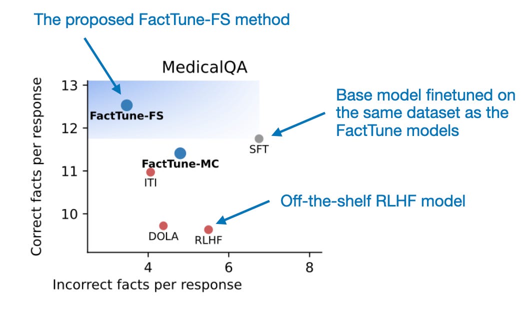Note that the authors experimented with finetuning Llama 1 and Llama 2. However, they didn't specify which model was finetuned in the figure above. Based on matching the numbers from Table 2 in the paper, I assume it is the Llama 2 model. Here, RLHF refers to the Llama 2 Chat model provided by Meta. The SFT model is a Llama 2 model they finetuned with regular supervised learning (instead of DPO on preference data), using the same biographies and medical QA datasets as for the FactTune-FS model.