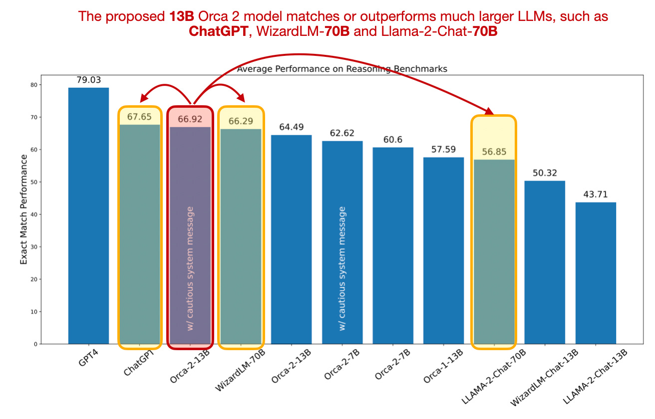 Moreover, Orca-2-13B can also compete with models that are 5-10x larger, like LLaMA-2-Chat-70B, WizardLM-70B, and ChatGPT.