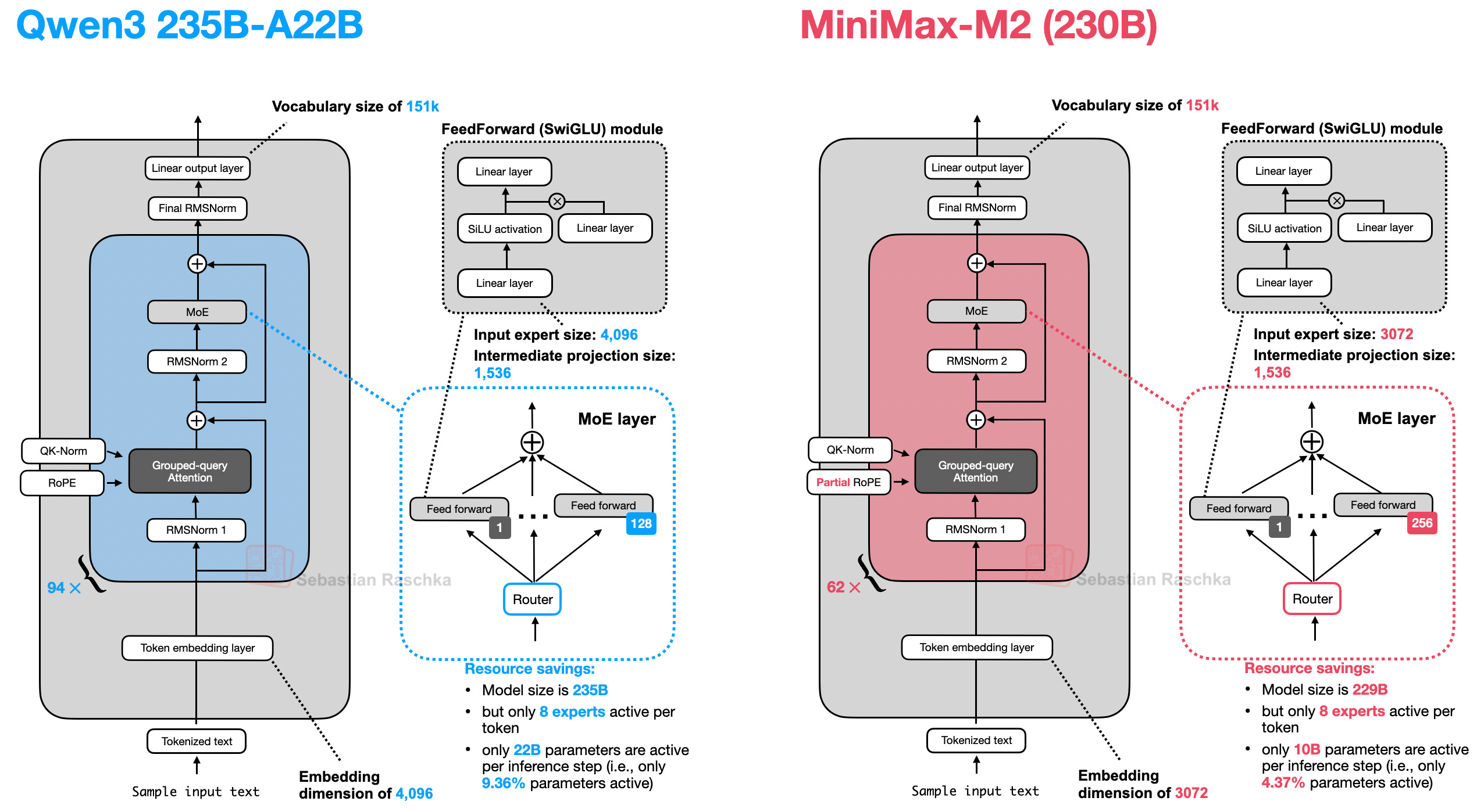 Overall, MiniMax-M2 is surprisingly similar to Qwen3. Besides changing the number of layers, sizes, etc., it uses the same components overall.