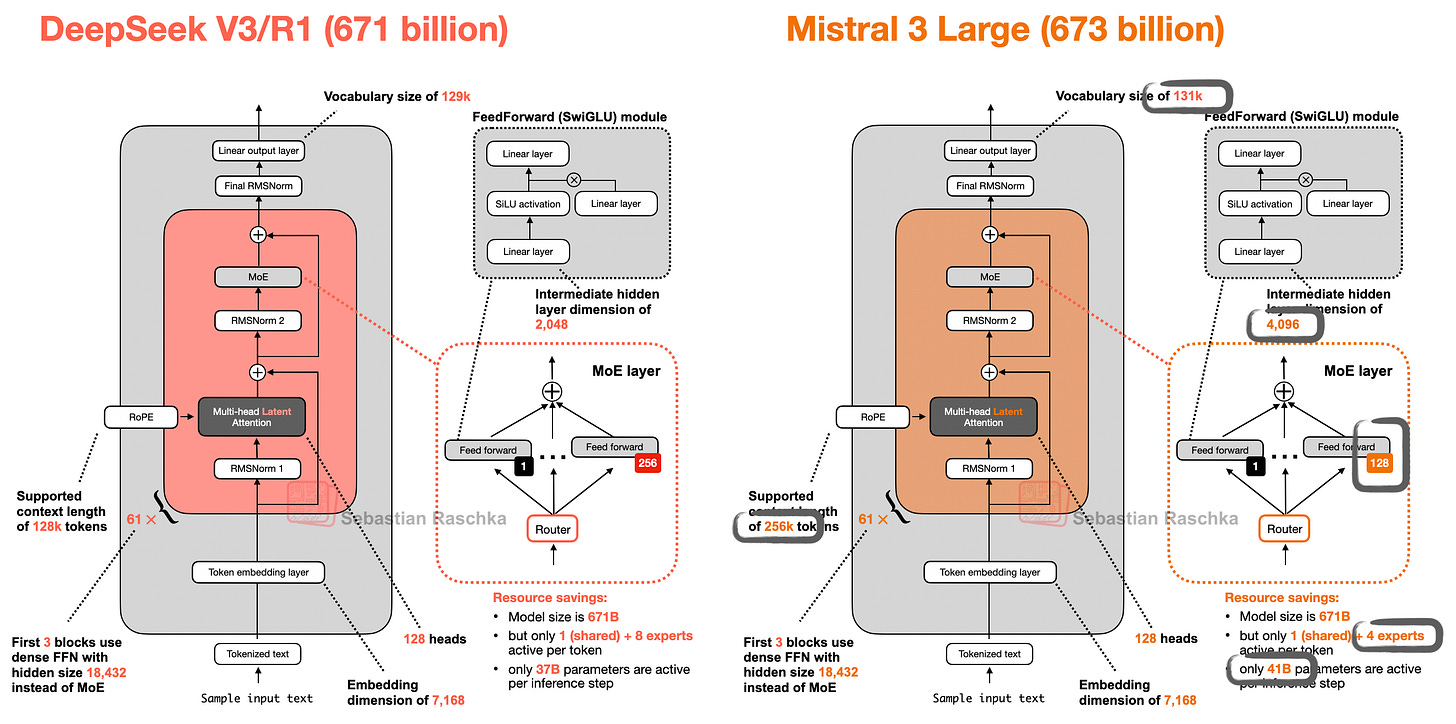 As it turns out, Mistral 3 Large is exactly the same architecture as DeepSeek V3 and V3.1! The only difference is that they increased the size of the experts by a factor of 2 while decreasing the number of experts by the same factor.