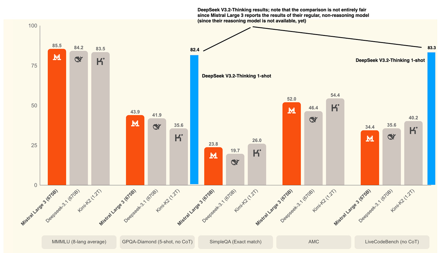Unfortunately, it’s not possible to do an apples-to-apples comparison right now, because Mistral 3 Large currently doesn’t have a reasoning model, and DeepSeek V3.2 didn’t share the benchmark results for their non-thinking mode, but in case you are curious, I overlaid the DeepSeek V3.2-Thinking numbers (from the DeepSeek V3.2 report) with the Mistral 3 Large benchmark chart.