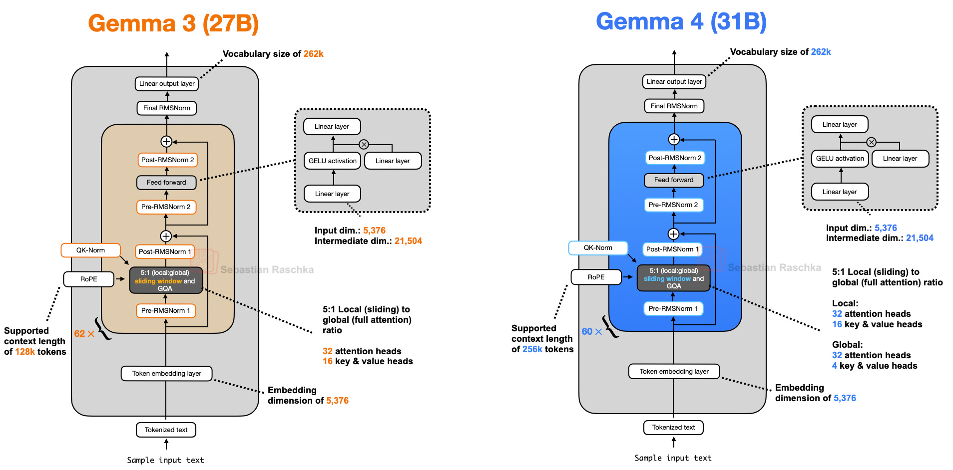 Architecture-wise, Gemma 4 (31B) looks pretty much unchanged compared to Gemma 3 (27B), as illustrated in the figure below.