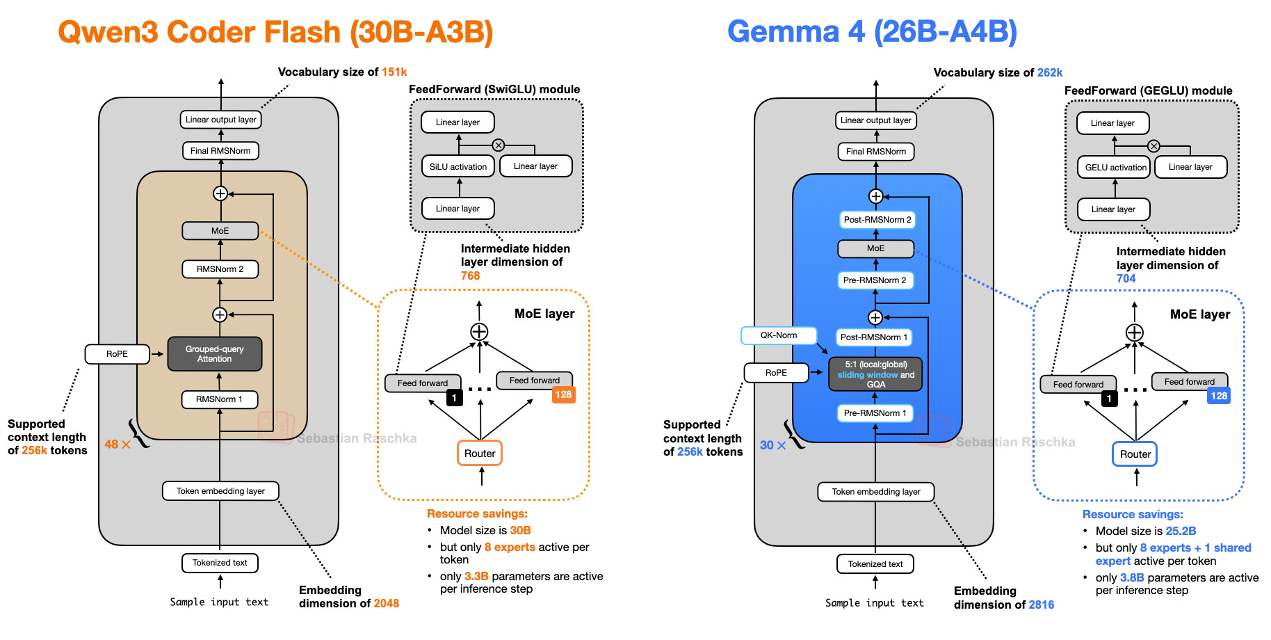 Note that there is also a Mixture-of-Experts (MoE) Gemma 4 variant, which is illustrated below next to a Qwen3 model of similar size.