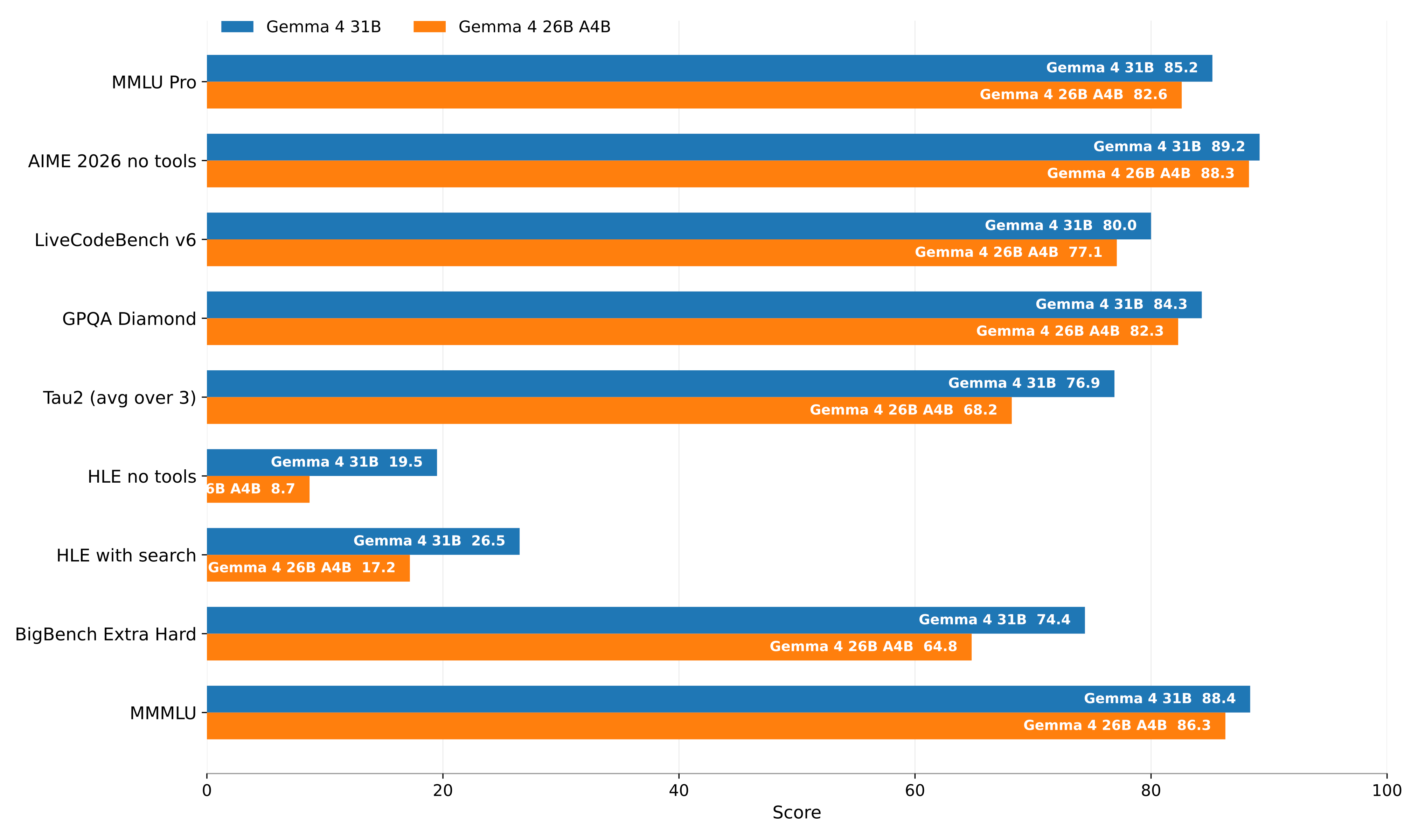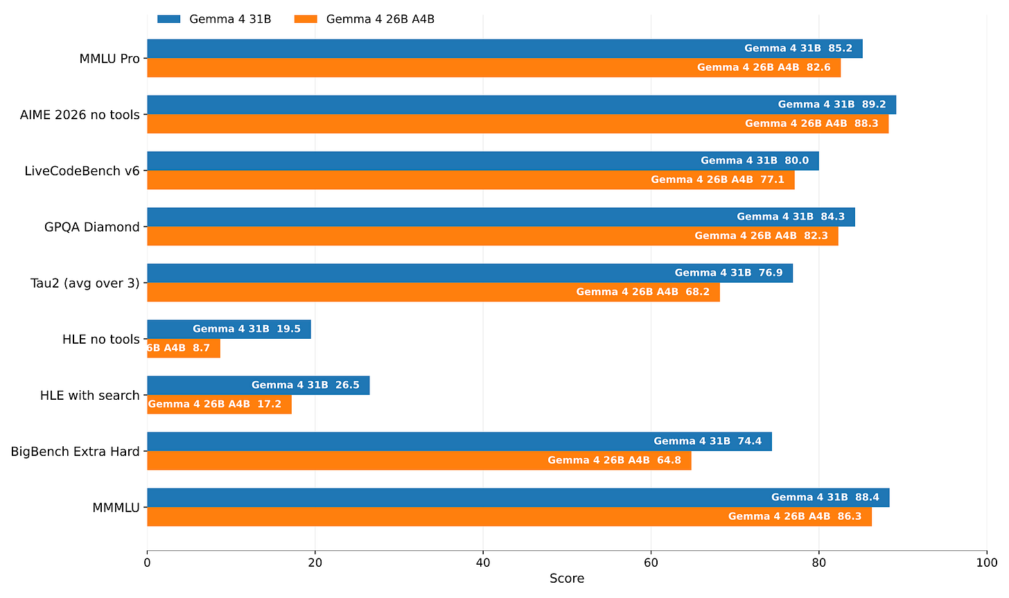 Benchmark-wise, the Gemma 4 MoE variant, which has 4B parameters less in total than the Gemma 4 (31B) dense variant, the performances are relatively similar.