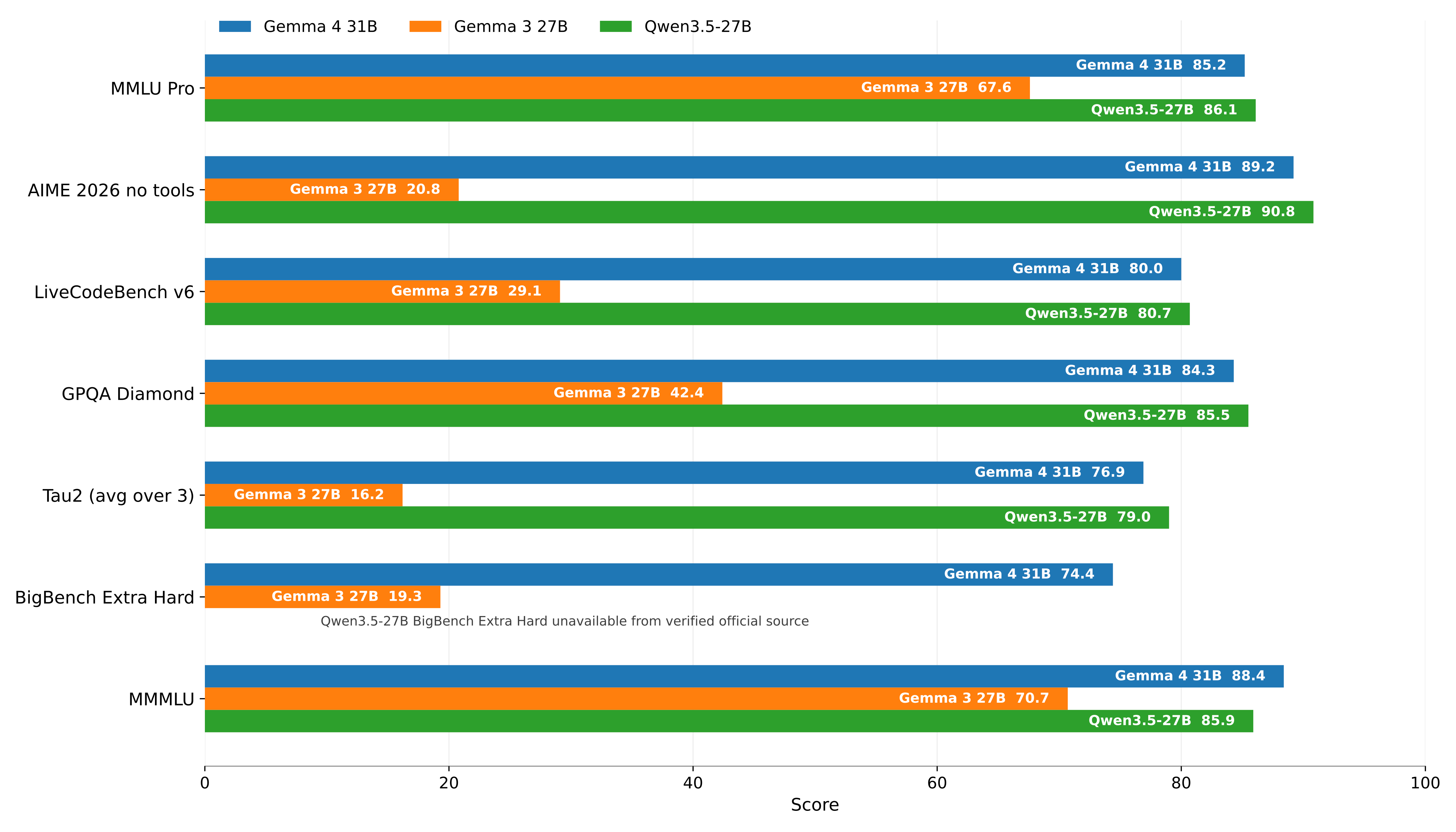 However, if we look at some other common benchmarks, which I plotted below, we can see that it’s indeed a very clear leap over Gemma 3 and ranks on par with Qwen3.5 27B.