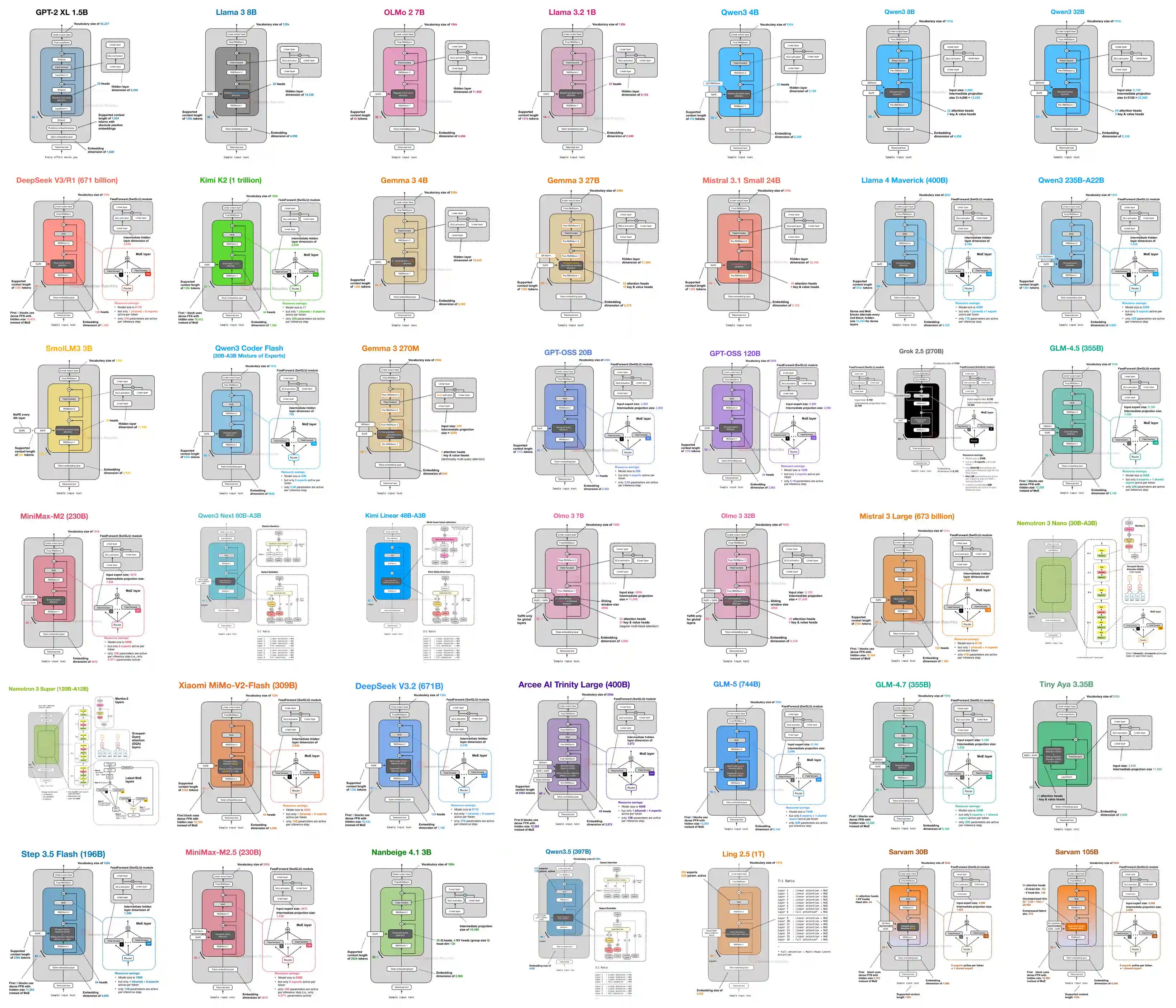 I covered Arcee AI’s Trinity Large and z.AI’s GLM-5 in sections 19 and 20 above. However, since there was a lot of content to cover for the January-February time period, I wrote a standalone article with more information about the 10 architectures listed above here: