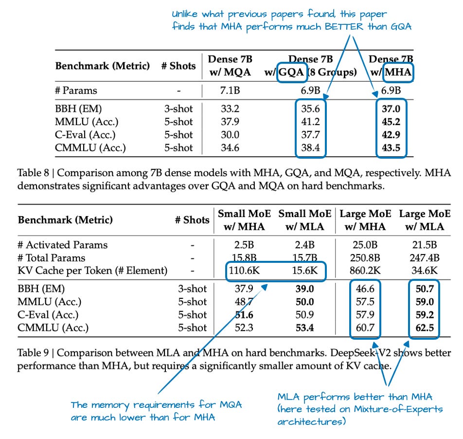 The DeepSeek-V2 paper provided some ablations where GQA looked worse than MHA in terms of modeling performance, while MLA held up much better and could even outperform MHA when tuned carefully. That is a much stronger justification than “it (also) saves memory.”
