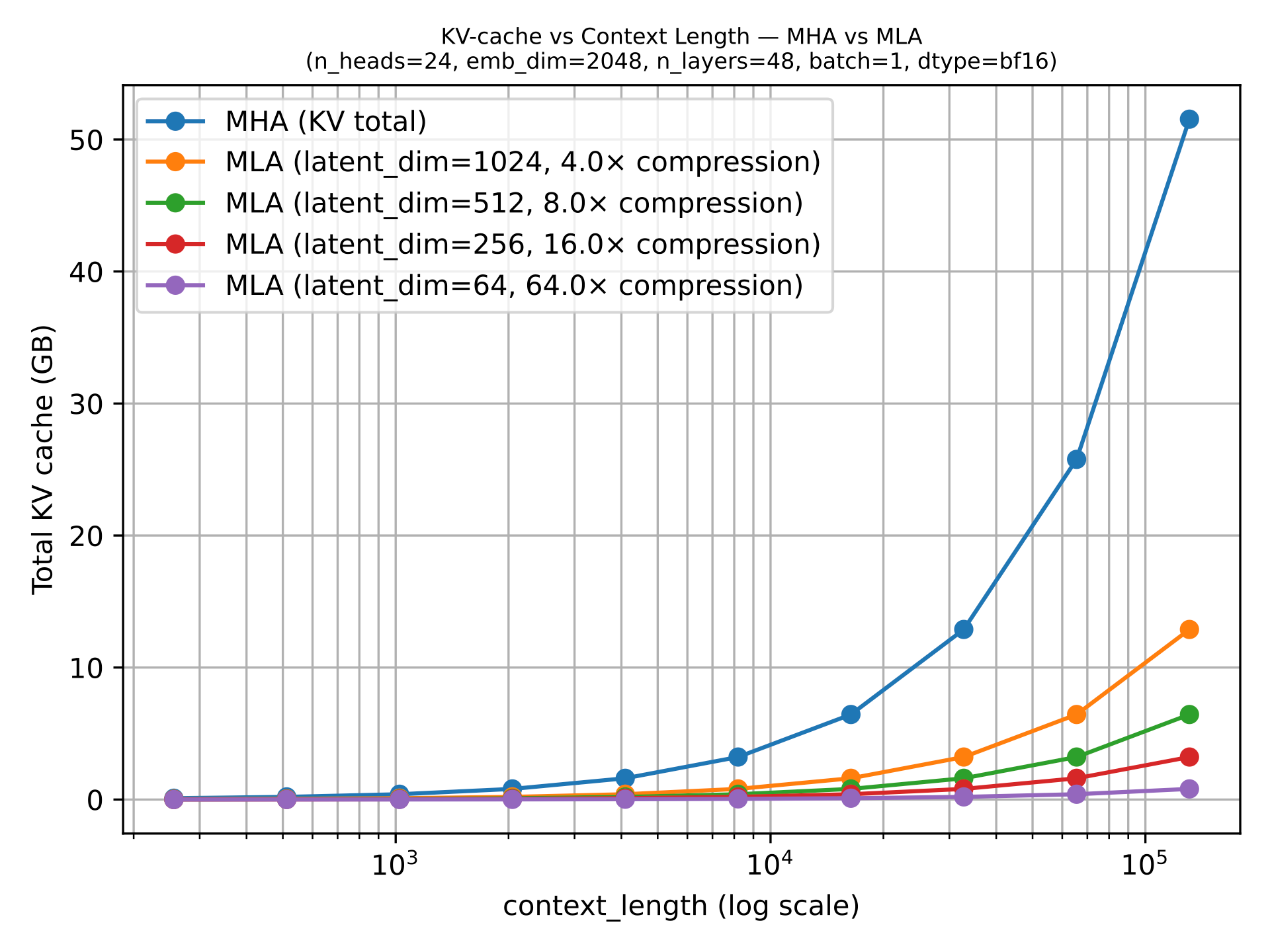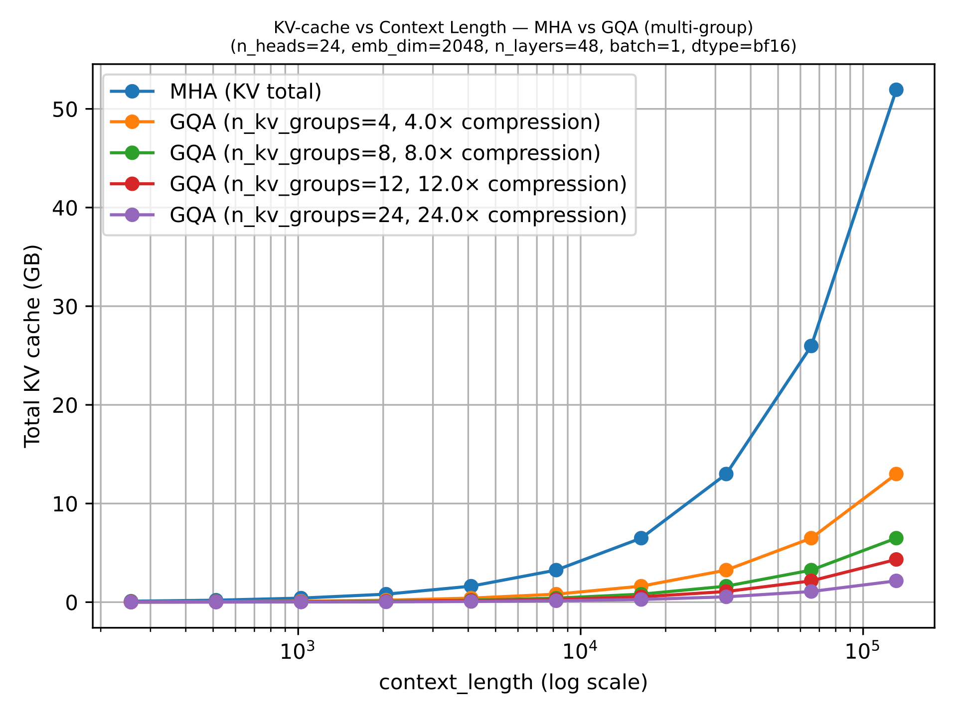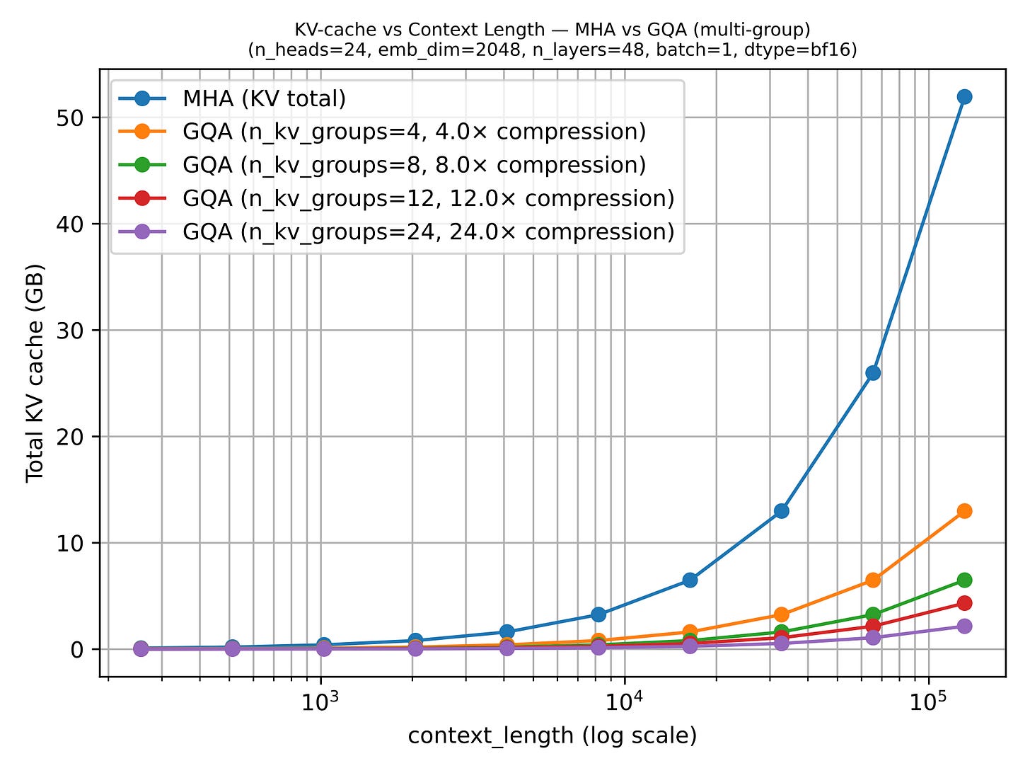 GQA results in big savings in KV storage, since the fewer key-value heads we keep per layer, the less cached state we need per token. That is why GQA becomes more useful as sequence length grows.