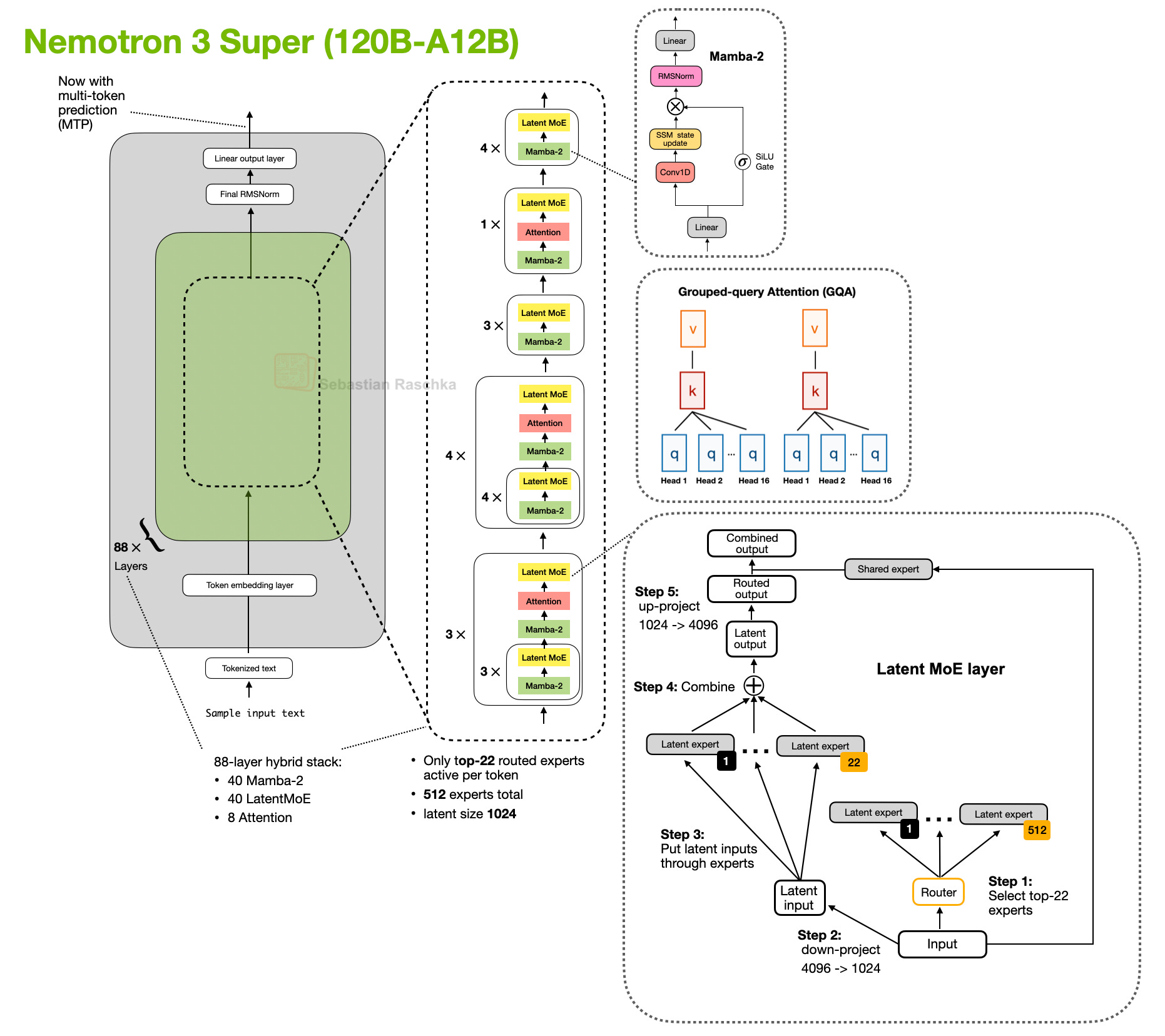 The larger Nemotron 3 Super keeps the Mamba-2 hybrid attention approach and adds other efficiency-oriented changes such as latent MoE and shared-weight multi-token prediction (MTP) for speculative decoding.