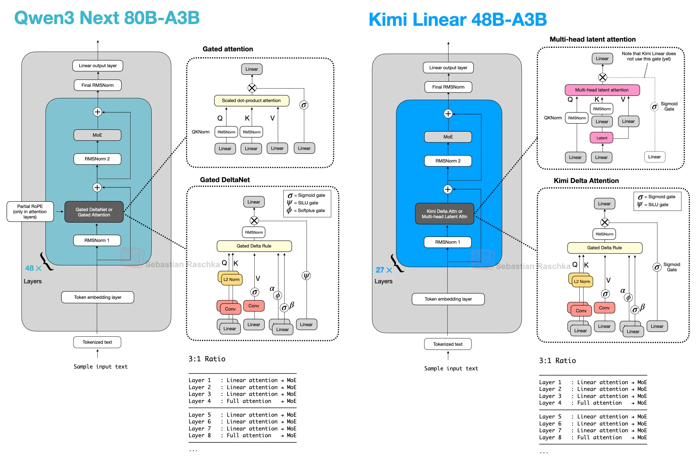 On the lightweight side, Kimi Delta Attention is a refinement of Gated DeltaNet. Where Qwen3-Next uses a scalar gate per head to control memory decay, Kimi uses channel-wise gating, which gives finer control over the memory update. On the heavier side, Kimi replaces Qwen3-Next’s gated-attention layers with gated MLA layers.