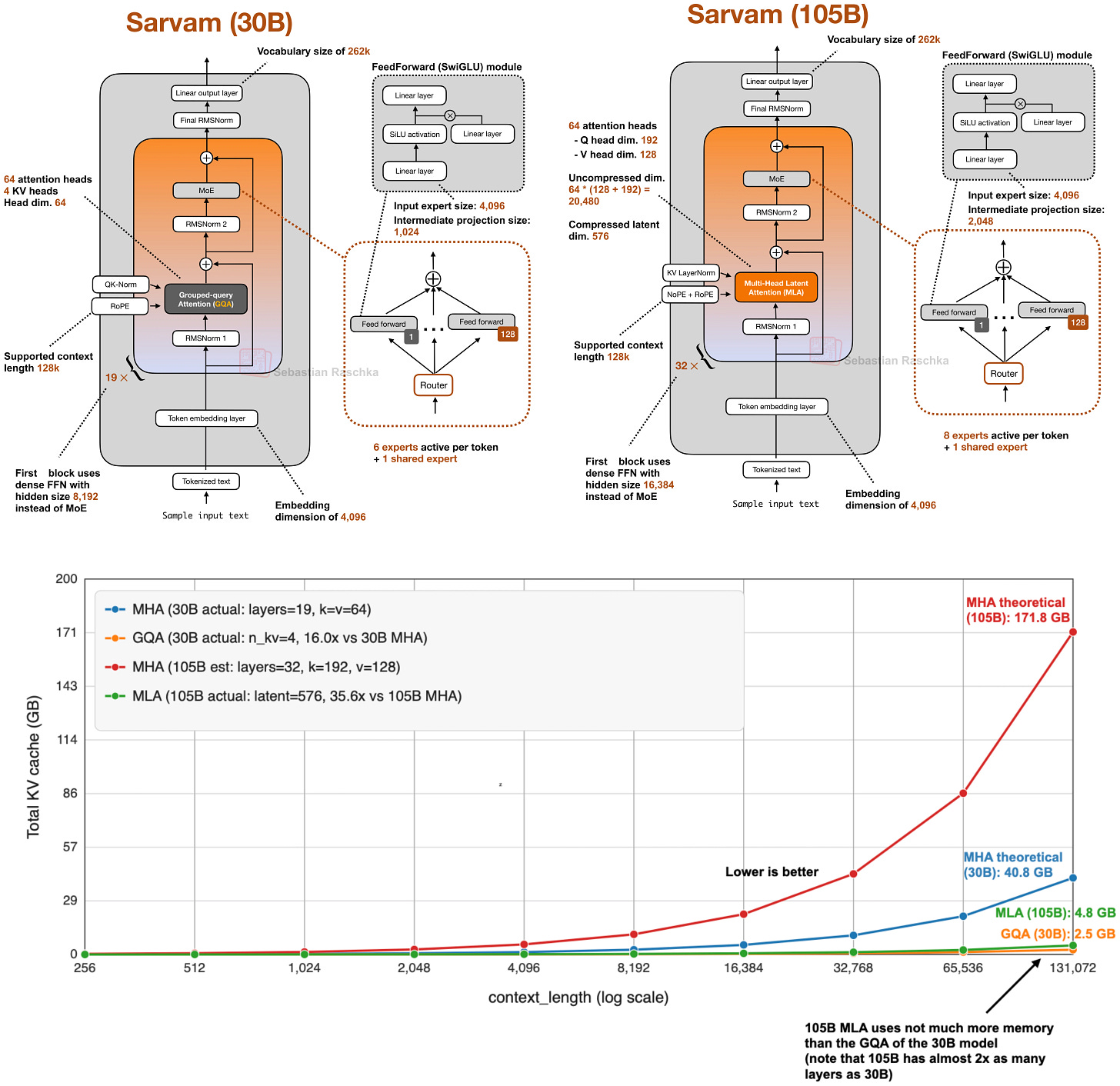 That is why some of the newer releases still stay deliberately classic here. E.g., in my Spring Architectures article, I mentioned that MiniMax M2.5 and Nanbeige 4.1 as models that remained very classic, using only grouped-query attention without piling on other efficiency tricks. Sarvam is a particularly useful comparison point as well: the 30B model keeps classic GQA, while the 105B version switches to MLA.
