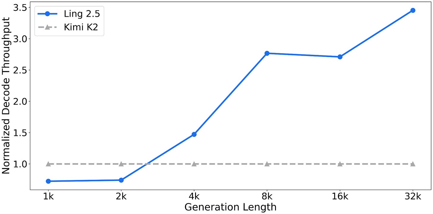 Ling 2.5 is aimed more at long-context efficiency than at absolute benchmark leadership. According to the Ling team, it was reported as substantially faster than Kimi K2 at 32k tokens, which is the practical payoff these hybrids are aiming for.