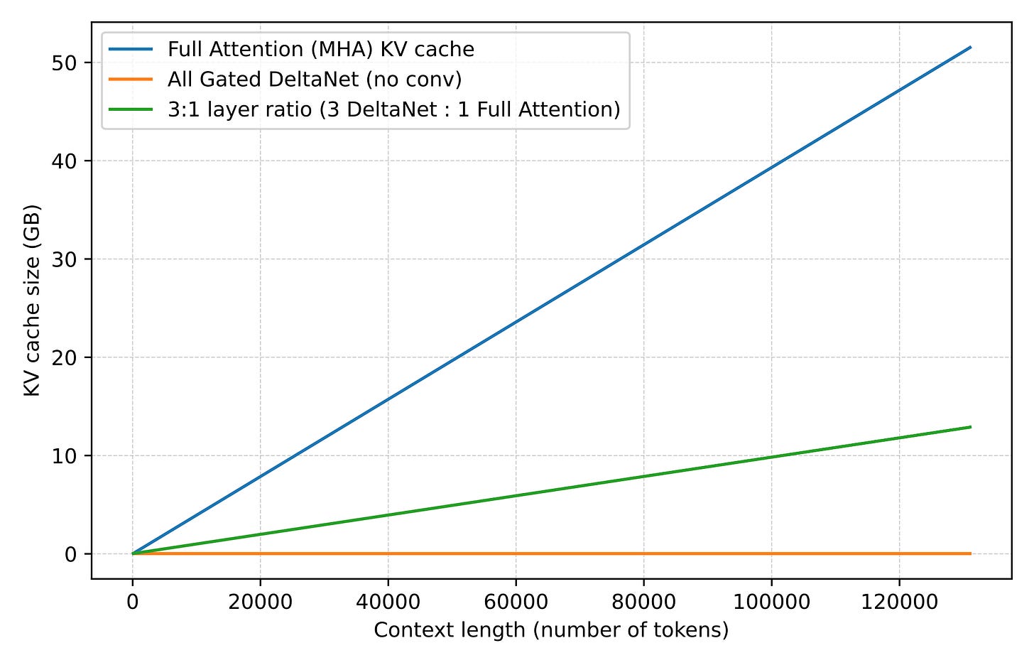 Here, lightweight Gated DeltaNet blocks do most of the long-context work and keep memory growth much flatter than full attention. The heavier gated-attention layer remains because DeltaNet is less exact at content-based retrieval.