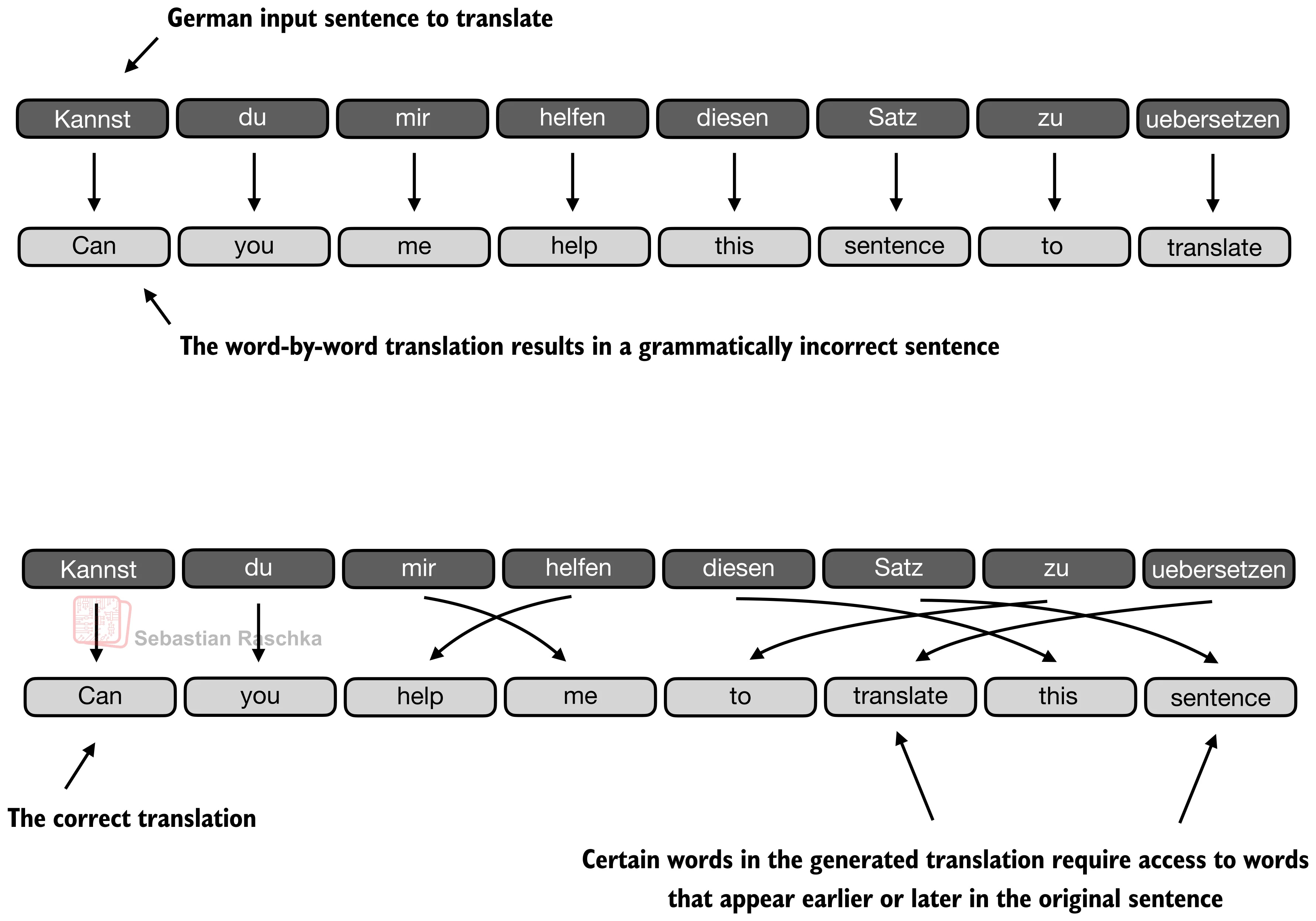The translation example below shows one of the limitations of this idea. For instance, a sentence can preserve many locally reasonable word choices and still fail as a translation when the model treats the problem too much like a word-by-word mapping. (The top panel shows an exaggerated example where we translate the sentence word by word; obviously, the grammar in the resulting sentence is wrong.) In reality, the correct next word depends on sentence-level structure and on which earlier source words matter at that step. Of course, this could still be translated fine with an RNN, but it would struggle with longer sequences or knowledge retrieval tasks because the hidden state can only store so much information as mentioned earlier.