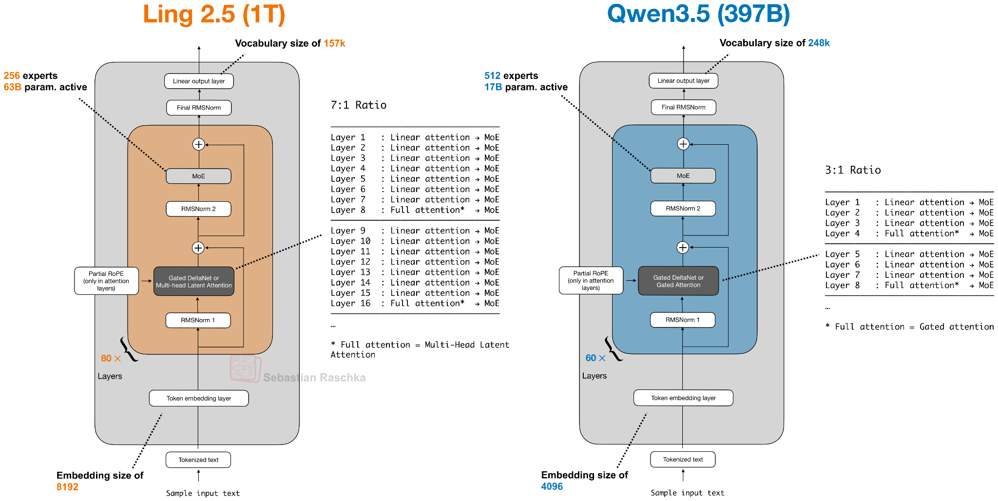 Ling 2.5 shows another swap on the lightweight side. Instead of Gated DeltaNet, Ling uses a slightly simpler recurrent linear attention variant called Lightning Attention. On the heavier side, it keeps MLA from DeepSeek.