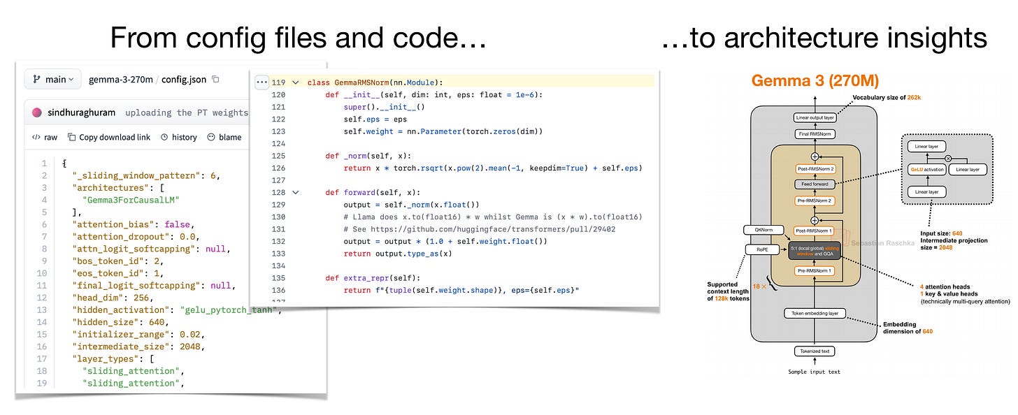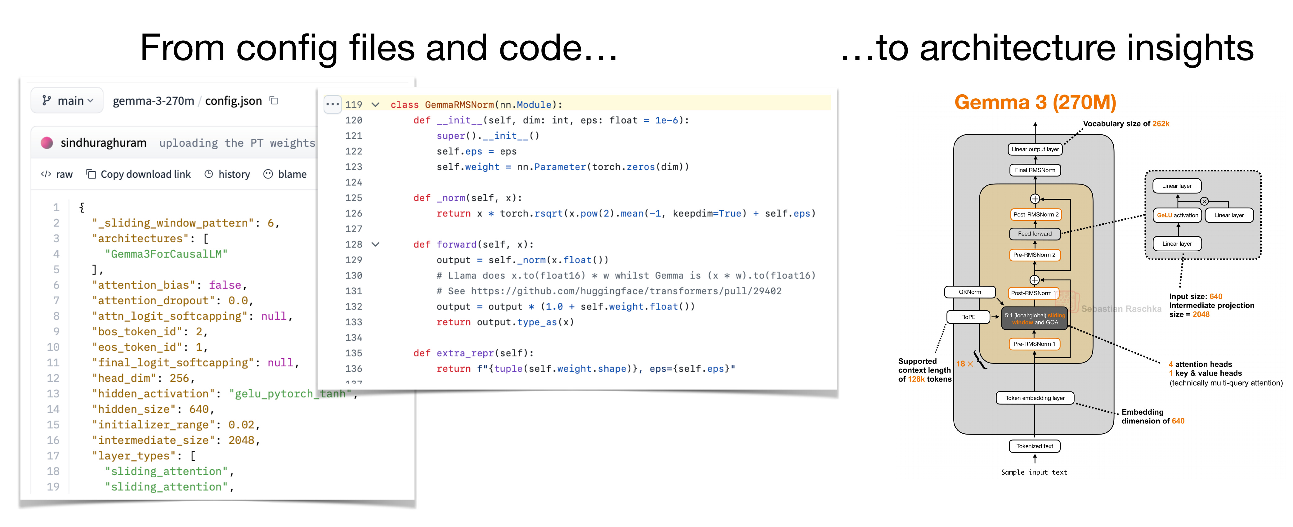 The good part is that if the weights are shared on the Hugging Face Model Hub and the model is supported in the Python transformers library, we can usually inspect the config file and the reference implementation directly to get more information about the architecture details. And “working” code doesn’t lie.